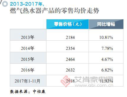 國(guó)內(nèi)外品牌紛紛加碼高端市場(chǎng)的新攻勢(shì),直接帶動(dòng)了燃?xì)鉄崴鳟a(chǎn)品整體均價(jià)的大幅上揚(yáng)。據(jù)中怡康數(shù)據(jù)顯示,2017年1-11月份,燃?xì)鉄崴鞯牧闶劬鶅r(jià)上漲了11.92個(gè)百分點(diǎn)至2938元。盡管考慮到中怡康的監(jiān)測(cè)樣本以連鎖賣場(chǎng)為主,價(jià)格系數(shù)會(huì)相應(yīng)偏高,但如此大的漲幅印證了燃?xì)鉄崴髡诩铀佼a(chǎn)品結(jié)構(gòu)的調(diào)整和升級(jí)。據(jù)《艾肯家電》統(tǒng)計(jì),2017年,我國(guó)燃?xì)鉄崴鳟a(chǎn)品的整體均價(jià)大致維持在2055元左右,同比漲幅約6.15%。