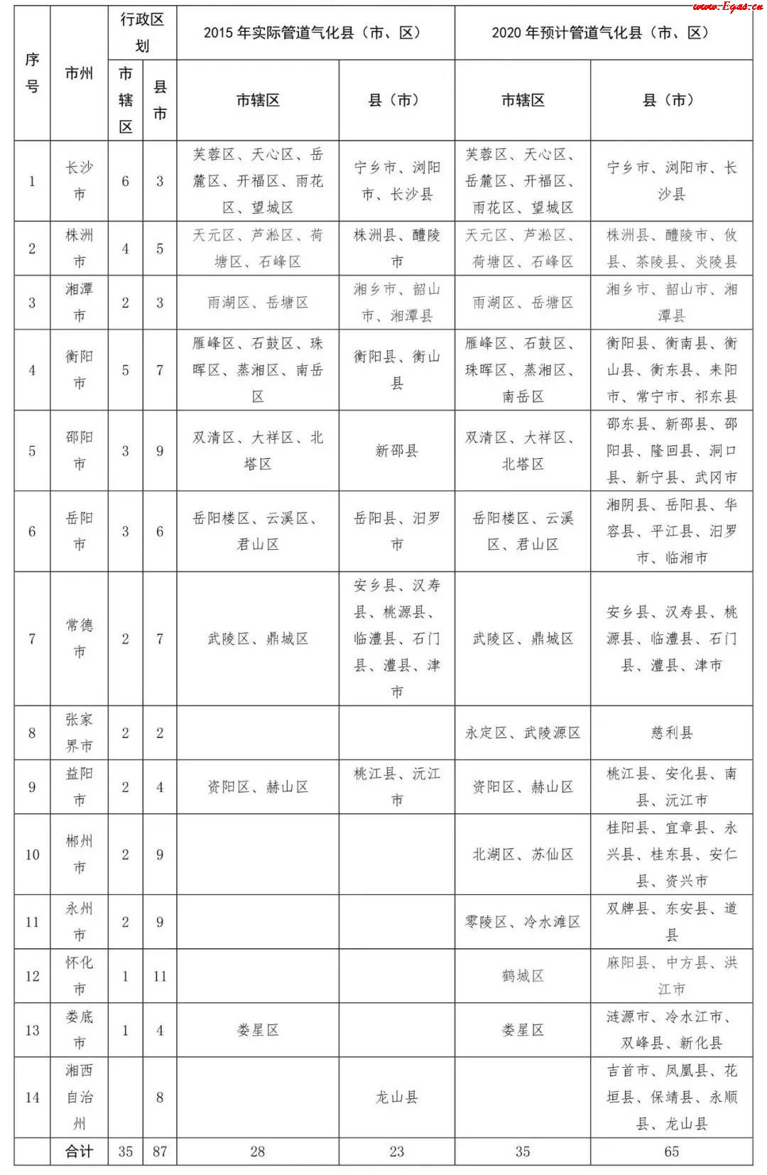 表2:全省天然氣管道氣化區(qū)域統(tǒng)計表