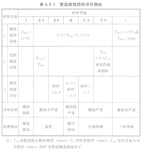 4.5.1管道腐蝕損傷評(píng)價(jià)的方法應(yīng)符合現(xiàn)行行業(yè)標(biāo)準(zhǔn)《鋼制管道及儲(chǔ)罐腐蝕評(píng)價(jià)標(biāo)準(zhǔn)埋地鋼質(zhì)管道外腐蝕直接評(píng)價(jià)》SY/T0087.1的有關(guān)規(guī)定。當(dāng)采用剩余壁厚、危險(xiǎn)截面和剩余強(qiáng)度三個(gè)層次逐級(jí)評(píng)價(jià)時(shí),管道腐蝕損傷評(píng)價(jià)指標(biāo)應(yīng)符合表4.5.1的規(guī)定。