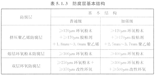 5.1.3管道防腐層宜采用擠壓聚乙烯防腐層、熔結(jié)環(huán)氧粉末防腐層、雙層環(huán)氧防腐層等,普通級(jí)和加強(qiáng)級(jí)的防腐層基本結(jié)構(gòu)應(yīng)符合表5.1.3的規(guī)定。