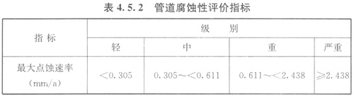 4.5.2管道腐蝕速率應(yīng)采用最大點(diǎn)蝕速率指標(biāo)進(jìn)行評(píng)價(jià)。管道腐蝕性評(píng)價(jià)指標(biāo)應(yīng)符合表4.5.2的規(guī)定。