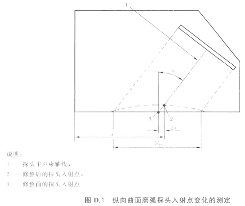 修整后的探頭入射點(diǎn)將會(huì)沿著標(biāo)記線移動(dòng),并且它的新位置可以用手工方法直接在探頭外殼上測(cè)定,如圖D.1所示。