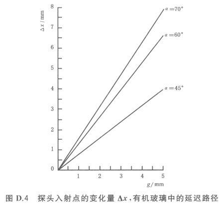 有機(jī)玻璃斜楔(cd=2730m/s),非合金鋼被檢件(ct=3255m/s),探頭入射點(diǎn)位置的變化量(Dx),三個(gè)最常用的聲束角度和修正深度(g)可從圖D.4中讀出。