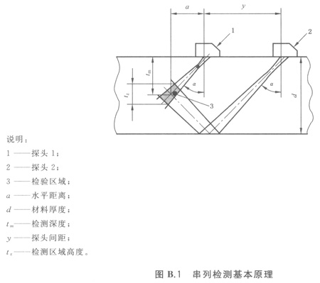 斜探頭間距(y)、聲束軸線交叉點檢測深度(tm)和檢測區(qū)域高度(tz)之間的關系見圖B.1。