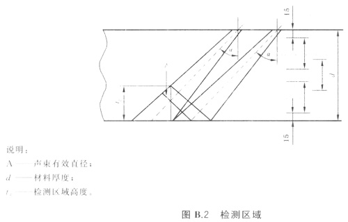 檢測區(qū)域高度(tz)可用參考試塊上不同深度反射體來測定,或用接近對面最大聲程結合聲束有效直徑來計算: