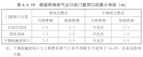 4.6.10穿外墻的煙道終端排氣出口距門(mén)窗洞口的最小凈距應(yīng)符合表4.6.10的規(guī)定。距地面的垂直凈距不得小于0.3m。煙道終端排氣出口應(yīng)設(shè)置在煙氣容易擴(kuò)散的部位。