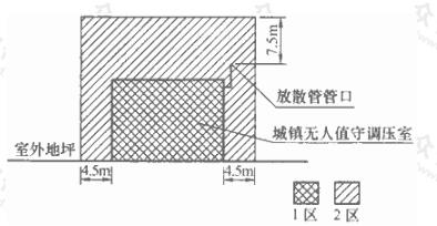 調(diào)壓室內(nèi)部的空間為1區(qū)。調(diào)壓室建筑物外壁4.5m內(nèi),屋頂(以放散管管口計)以上7.5m內(nèi)的范圍為2區(qū)。