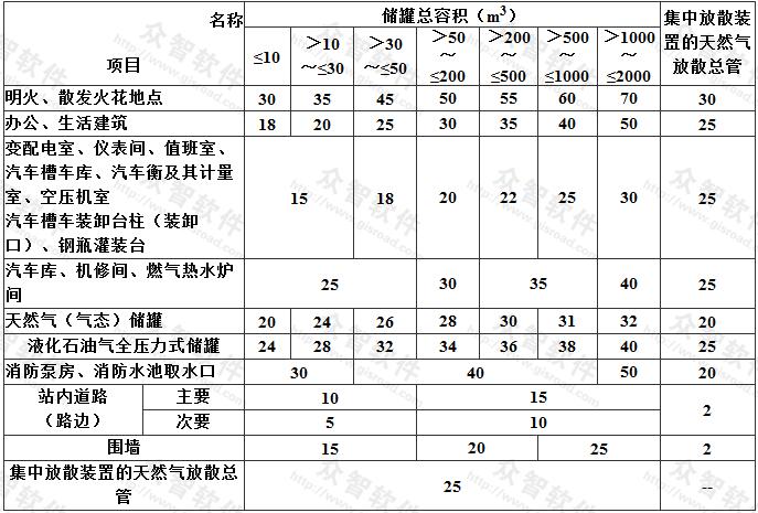 2 表9.2.5中集中放散裝置的天然氣放散總管與站內(nèi)建、構(gòu)筑物的防火間距,是參照本規(guī)范天然氣門站、儲配站的集中放散裝置放散管的有關(guān)規(guī)定編制的。