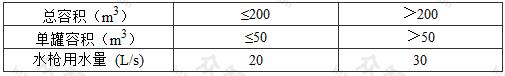 2 總?cè)莘e小于50m3且單罐容積小于等于20m3的液化天然氣儲罐或儲罐區(qū),可單獨(dú)設(shè)置固定噴淋裝置或移動水槍,其消防水量應(yīng)按水槍用水量計(jì)算。