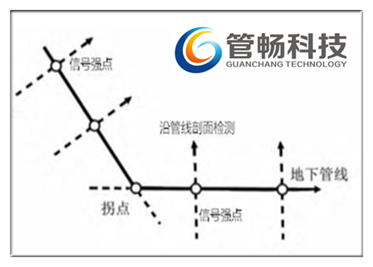 探測三通點時,也可采用間接的幾何交匯法;當我們發(fā)現(xiàn)疑似三通位置時(通常在遇到三通時,三通位置信號會異常強烈),在與主管線垂直方向3米以外橫切探測,找出信號最強的一個點后,在其延伸方向再找出第二個信號最強點,兩點連成一條直線,用交匯法就可以定出三通點的位置。