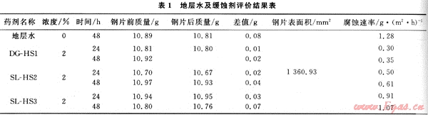 參照SY/T5390—91鉆井液腐蝕性能評價方法,在溫度120℃密閉條件下,熱滾16h后,測定了包括地層水及咪唑啉(SL-HS2)和聚季銨鹽(DG-HS1)、有機磷酸鹽(SL-HS3)復(fù)合緩蝕劑等在內(nèi)的3種介質(zhì)進(jìn)行了腐蝕速率的測定結(jié)果見表1。