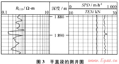 圖3為資料中感應電阻率曲線(RILD)及同次測井帶測的張力曲線(TEN)、速度曲線(SPD)。軟件利用曲線擬合法檢查出1888.11~1889.21m為平直段(幅度值均為0.2Ω·m,該段相對均方差為0),同時張力曲線和速度曲線在相應的深度段沒有明顯異常,說明并不是因為儀器遇卡現象引起的平直段.因此軟件判斷1888.11~1889.21m為平直異常。