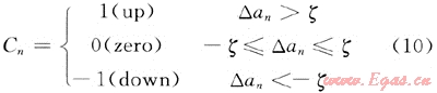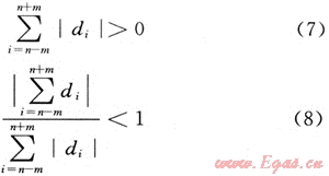 式(7)說明在第n個點附近存在較大變化,在滿足式(7)的同時滿足式(8)說明在該點附近也存在較大的反向變化,可判斷為“跳動”。