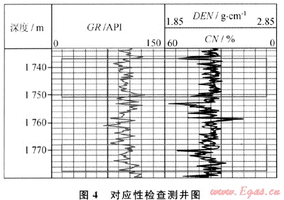 圖4是資料中伽馬曲線(GR)、密度曲線(DEN)、中子曲線(CN)。以GR曲線為基準曲線劃分層段并挑選層段,1736.81~1750.61m和1768.01~1777.51m(圖中紅框標示)是軟件挑選的兩個層段,在兩個層段DEN曲線和CN曲線的相關系數分別為-0.75和-0.74,與預先設置的規(guī)則(負相關、最小相關系數0.7,依據地區(qū)經驗設置)相比,軟件判斷DEN曲線和CN曲線的對應性合格。