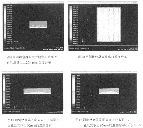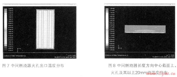 熱態(tài)數(shù)模計(jì)算得到了中間燃燒器和兩側(cè)燃燒器的火孔出口以及火孔以上20mm的溫度分布,見圖7到圖12。由圖中可以看出,無論是中間燃燒器,還是兩側(cè)燃燒器,火焰都比較均勻,火孔以上有約6mm高度的短火焰,很快燃燒完全,火焰溫度達(dá)到1000℃,與樣機(jī)試驗(yàn)的實(shí)際燃燒溫度相吻合。