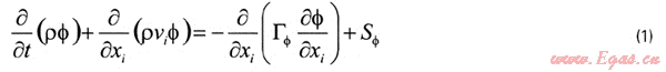當(dāng)式中的特性量Φ分別為常數(shù)1、速度Vi、比熱焓h和組分濃度c時(shí),通用微分方程就分別表示質(zhì)量方程、動(dòng)量方程、能量方程和組分?jǐn)U散方程;后三個(gè)方程中相應(yīng)的輸運(yùn)系數(shù),則分別為動(dòng)力粘度、導(dǎo)熱系數(shù)和擴(kuò)散系數(shù)。