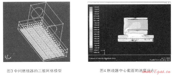 邊界條件包括進(jìn)口處的氣體流量、速度、溫度和組分,并假定經(jīng)過燃燒器頭部的多孔均流板,氣體速度和組分實(shí)現(xiàn)均勻分布。模擬計(jì)算采用的燃?xì)馐?span>12T天然氣,過??諝庀禂?shù)α=1.05,火孔熱強(qiáng)度9.1W/mm2,氣體進(jìn)口溫度為20℃。應(yīng)用Fluent5/6求解器作了數(shù)值計(jì)算。