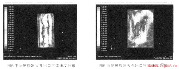 燃燒器中心截面的速度分布如圖4。中間燃燒器和兩側(cè)燃燒器的火孔出口氣體速度分布見圖5和6。出,經(jīng)過多孔均流板以后,燃燒器頭部的火孔出口氣流速度基本均勻,達(dá)到4.Om/s。