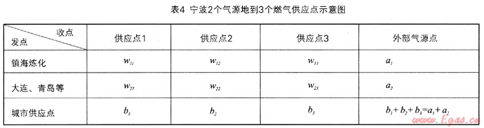 假設(shè)有m個外來氣源點,n個該城區(qū)燃氣供應(yīng)(銷售)點。則令以a1,a2,…am表示各外來氣源點運至該市的輸出量,b1,b2,…,bn表示各供應(yīng)(銷售)點的燃氣容納量(銷售量),有∑ai=∑bj。xij表示氣源地i運往供應(yīng)點j的運氣量,wij表示相應(yīng)的單位運氣量的運輸時間(單位運氣量的運輸時間因運輸方式的不同而改變),如表2所示