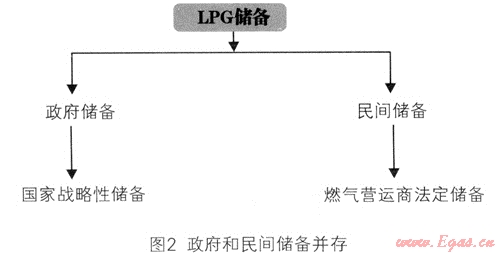 目前世界上的LPG儲備主要有兩種儲備模式:如美國,有多家資本雄厚的大型燃氣能源經(jīng)營企業(yè),這些企業(yè)自發(fā)建立大量儲備;如日本、韓國,由政府和民間共同承擔(dān)LPG儲備。國家建立公共儲備的同時,強制企業(yè)建立一定的商業(yè)儲備。如圖2所示