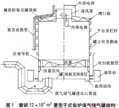攀鋼12×104m3曼型干式焦爐煤氣儲氣罐采用單管布置(進、出氣共用一根管道),主要結構見圖1。