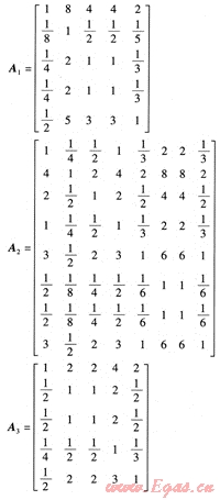 通過mat lab計算得到各成對比較矩陣的最大特征值分別為: