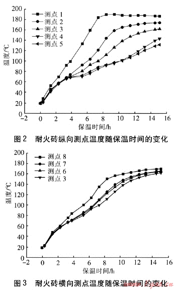 干燥窯內(nèi)耐火磚縱向測點和橫向測點的溫度隨保溫時間的變化分別見圖2和圖3。