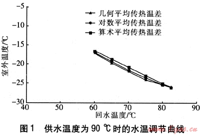 量調(diào)節(jié)的基本思路是供水溫度保持不變,熱水流量隨建筑負(fù)荷變化而變化。當(dāng)供水溫度為90℃時(shí),由式(7)可計(jì)算得到不同室外溫度下的回水溫度及相對(duì)流量比,由此可得到特定供水溫度下采用不同形式平均傳熱溫差的水溫、流量調(diào)節(jié)曲線(見(jiàn)圖1、2)。