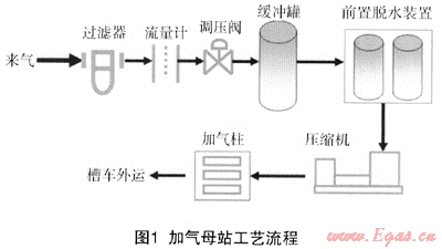 加氣母站一般建設在天然氣主管道附近,將主管道內的氣體進行壓縮至20MPa后儲存在轉運車槽罐內,然后再運到無氣源的子站供氣。它的主要特點是靠近主管網,進氣壓力穩(wěn)定且較高。加氣母站設備主要由氣體預處理系統(tǒng)(進站計量裝置、調壓裝置、過濾裝置、深度脫水裝置等)、壓縮機組、售氣機等設備組成。其主要工藝流程如圖1所示。