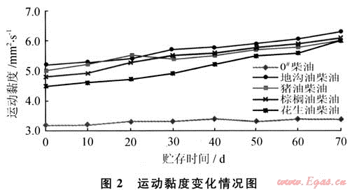 生物柴油貯存安定性就是測定油品中沉渣的生成情況,從圖3可看出生物柴油在貯存過程中沉渣的變化情況:0#柴油貯存80d后沉渣也基本上沒有變化,而生物柴油的沉渣相對變化較大,地溝油為原料制備的生物柴油,其沉渣量最大,貯存80d后達(dá)到8.5mg/100mL。沉渣的來源可能是:生物柴油在貯存過程中緩慢發(fā)生了聚合等作用,生成了大分子物質(zhì),在鹽類的作用下,絮凝成沉渣。從沉渣的變化量也反映出生物柴油的貯存穩(wěn)定性比0#柴油差。
