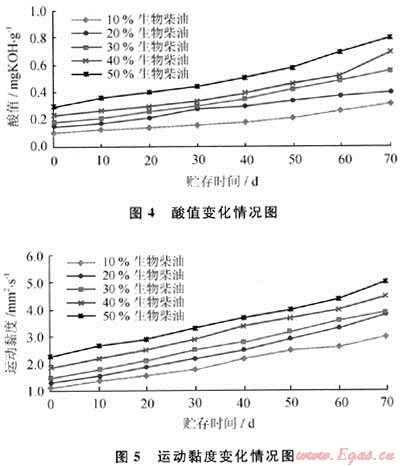 2) 在生物柴油調(diào)和燃料油中,生物柴油摻入比例越大,穩(wěn)定性越差。生物柴油摻入量應(yīng)控制在50%以內(nèi),貯存期不超過80d為宜。
