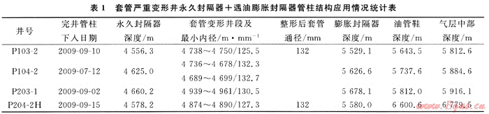 普光氣田套管變形井發(fā)生后,通過(guò)普光氣田主體嚴(yán)重套管變形井綜合修井技術(shù)研究,采用井下震擊整形技術(shù)、滾壓整形技術(shù)實(shí)現(xiàn)套管擴(kuò)徑,普光103-2、204-2H井整形后通徑達(dá)到132~134mm,保證小直徑遇油膨脹封隔器下井的要求;2009年7~9月份應(yīng)用外徑130mm遇油膨脹封隔器,采用“永久封隔器+遇油膨脹封隔器”采氣管柱結(jié)構(gòu),先后完成了普光103-2、104-2、203-1定向井、204-2H水平井投產(chǎn)作業(yè)施工,現(xiàn)場(chǎng)應(yīng)用效果較好(見(jiàn)表1),對(duì)高含硫嚴(yán)重套管變形井修井投產(chǎn)具有重要現(xiàn)實(shí)意義。