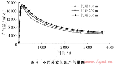 從圖6可以看出,隨著分支長度的增加,產(chǎn)氣量和峰值產(chǎn)氣量都在增加,但是考慮到煤層邊界和井筒壓降的影響,分支長度也應該有一個比較合理的值。