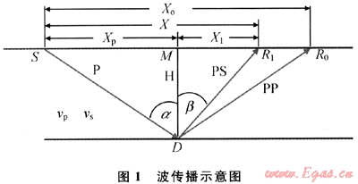波場的反射與轉換是同時發(fā)生的,于共反射點處有一組不同偏移距縱波產生時相應有一組共轉換橫波與之相伴而生??v波和轉換橫波同時向上傳播,到達地面后被儀器記錄下來。圖1為波的傳播路徑示意圖[2~5,8],界面深度為h,S為震源,由震源產生的下行P波遇到界面后,產生反射P波(P-P波)的同時,又轉換形成反射SV波(P-SV波),然后上行傳播到地面(圖1)。其中,R0是P-P波地面接收點,R1是P-SV波地面接收點,D是界面反射點位置,M是地面共中心點位置。