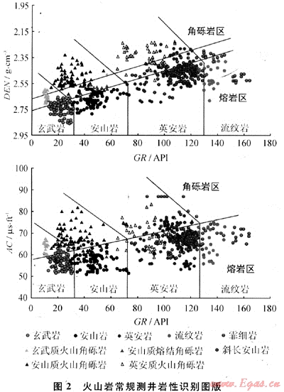 2) 建立火山巖地球物理測(cè)井響應(yīng)特征。首先完成了123塊樣品的全巖氧化物含量(特別是重礦物元素MnO、Fe203、TiO2等)和放射性元素(U、Th、K)含量分析,以針對(duì)性的實(shí)際資料證實(shí)了從基性到酸性火山巖U、Th、K的含量逐漸增大、放射性逐步增強(qiáng)以及重礦物含量逐漸減少的規(guī)律。然后以取心井為基礎(chǔ),用標(biāo)準(zhǔn)火山巖巖心標(biāo)定到測(cè)井曲線(xiàn)上,確定了不同巖性火山巖的典型測(cè)井響應(yīng)特征,強(qiáng)化了由基性巖到酸性巖自然伽馬值升高、密度降低、聲波時(shí)差值升高的基本規(guī)律。