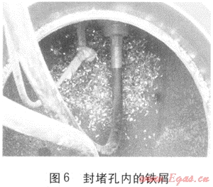② 管道開孔過程中產生的鐵屑很明顯(見圖6),除部分細微顆?;蚍勰┝⒓幢粴饬鞔档较掠?,依舊有部分較大塊的鐵屑暫時殘留在三通管件周圍,如施工單位或設備制造單位能設計一種專用工具(如磁性探棒),設法取出大部分殘留的鐵屑,將對下游設備安全穩(wěn)定運行產生深遠意義。
