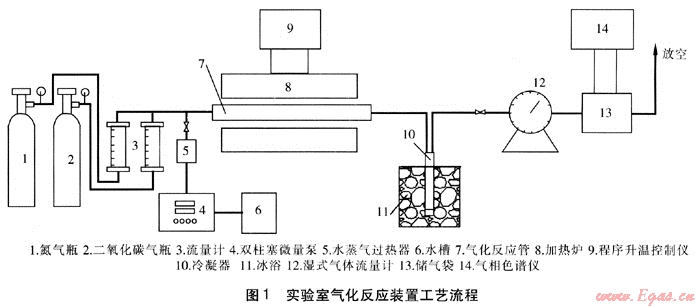 瓶裝氮?dú)饧岸趸細(xì)怏w分別經(jīng)流量計(jì)計(jì)量后進(jìn)入氣化反應(yīng)管;蒸餾水由雙柱塞微量泵計(jì)量后進(jìn)入水蒸氣過熱器,在水蒸氣過熱器中氣化為水蒸氣后進(jìn)入氣化反應(yīng)管;氣化反應(yīng)管由帶程序升溫控制儀的加熱爐加熱到設(shè)定溫度;反應(yīng)產(chǎn)生的氣體產(chǎn)物經(jīng)冷凝器冷凝,除去其中的焦油及水蒸氣,經(jīng)濕式氣體流量計(jì)計(jì)量后進(jìn)入儲氣袋,對儲氣袋中的氣體取樣分析后放空。