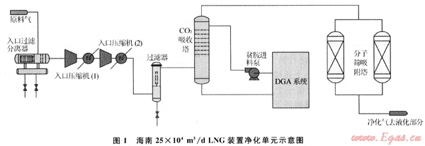 天然氣預(yù)處理系統(tǒng)包括過濾分離、增壓、二甘醇胺(DGA)脫CO2和分子篩干燥部分。流程簡(jiǎn)圖見圖1。