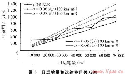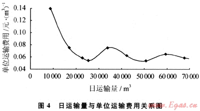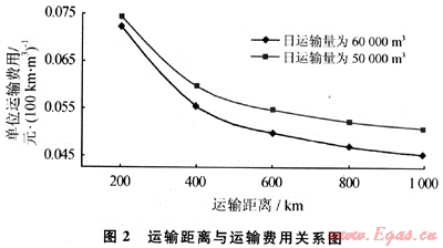 圖2為當(dāng)日運輸量為50000m3和60000m3時的運輸距離與單位運輸成本的關(guān)系。由圖2可知,當(dāng)日運輸量一定時,運輸距離越遠,單位運輸成本越低。因此運輸企業(yè)應(yīng)根據(jù)運輸距離的遠近及運輸量的大小制定不同的合理運輸價格。