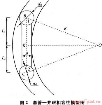 在采用常規(guī)下套管方法時(shí),以套管串在井眼出現(xiàn)“硬卡”問(wèn)題為臨界條件,建立套管、井眼幾何相容性模型(見(jiàn)圖2),其中B、C兩點(diǎn)是約束點(diǎn),代表套管接箍或扶正器,兩個(gè)支點(diǎn)間是套管柱。在圖2中,R是長(zhǎng)度為L(zhǎng)(L=L1+L2)的套管柱可通過(guò)的最大井眼曲率半徑,在井眼直徑(Ds)、上下兩支點(diǎn)直徑ds1、ds2,套管外徑(d)給定前提下,可推導(dǎo)出套管柱所能通過(guò)的最大井眼曲率(K=1/R)。