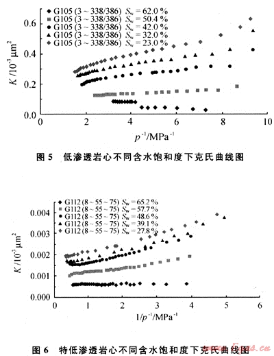 筆者的實驗研究結(jié)果與Rose得到的結(jié)論完全一致,就是氣體在低滲透巖心中的克氏效應(yīng)隨含水飽和度的增加而明顯減弱,其實驗結(jié)果見圖5、6。
