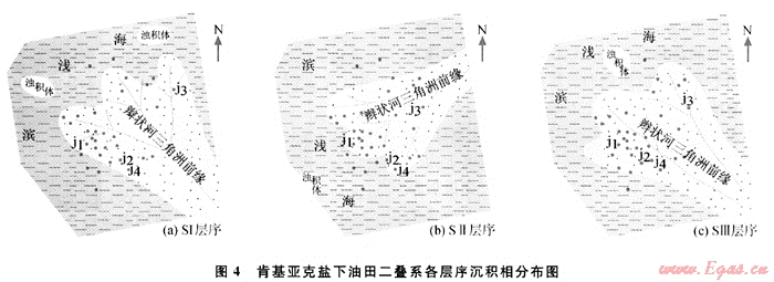 2) 肯基亞克鹽下油田二疊系主要發(fā)育辮狀河三角洲前緣、濁積體和濱淺海沉積。層序SⅠ、SⅢ辮狀河三角洲前緣從東南方由盆地邊緣向中心延伸,層序SⅡ辮狀河三角洲前緣從東北方由盆地邊緣向中心延伸,周圍為濱淺海沉積,在三角洲前緣向盆地延伸的前方發(fā)育了土豆狀的三角洲前緣滑塌濁積體。