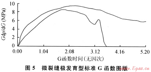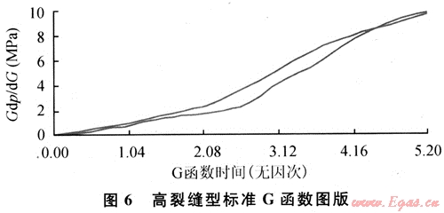 其特征主要表現(xiàn)為主裂縫閉合前G函數(shù)曲線凸起很高,一般數(shù)值在4以上(圖5)。該類儲層閉合前由于受多條微裂縫濾失影響,造成裂縫濾失不恒定且濾失大。