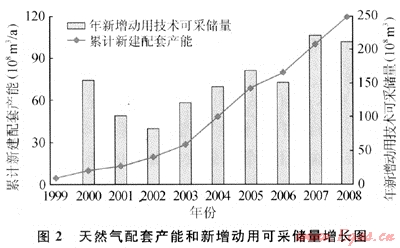 10年來,新建成沙坪場等15個新氣田,新增配套產能74×108m3/a;優(yōu)化調整老區(qū)補充產能建設,有效彌補了老氣田產能,新增配套產能45.5×108m3/a。新老區(qū)共計新增配套產能119.5×108m3/a,新增動用可采儲量1355×108m3(如圖2)。