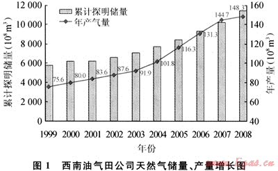 川渝地區(qū)天然氣工業(yè)始于20世紀50年代。1999年中國石油重組改制并在境外上市,西南油氣田公司(以下簡稱公司)負責川渝地區(qū)天然氣勘探開發(fā)業(yè)務。經過10年(1999~2009年)的艱苦奮斗,天然氣勘探屢獲重大突破,儲量快速增長,天然氣開發(fā)成果卓著。新建產能120×108m3/a(超過過去20年的建設總量),地面輸配氣能力達200×108m3/a,天然氣凈化能力達146×108m3/a,2004年天然氣產量突破100×108m3,2006年油氣當量突破一千萬噸大關,成為國內首個以天然氣生產為主的千萬噸級大油氣田。天然氣產量從1999年的75×108m3上升到2008年148×108m3,翻了近一番,年均增長10%(如圖1)。10年累計生產天然氣1060×108m3,占近50年總計產量的39%,天然氣開發(fā)實現了跨越式大發(fā)展。