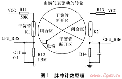 目前我國的IC卡燃氣表均采用脈沖計數方式,即在原基表機械計數器上加裝脈沖傳感裝置如干簧管、霍爾元件等,產生脈沖輸出,電子控制器對采集到的脈沖進行累計和換算,獲得數據。目前廣泛使用干簧管計數,脈沖計數原理見圖1。