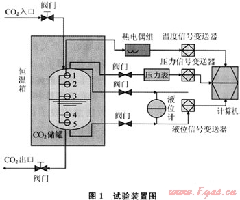 由于LNG的危險性,直接進(jìn)行大容量LNG儲罐的試驗非常困難,而模擬的理論基礎(chǔ)是氣液相平衡原理,對于各種尺度LNG儲罐都是適用的。因此本試驗采用小型儲罐,用C02介質(zhì)代替LNG進(jìn)行低溫液體蒸發(fā)率試驗,測試該低溫液體儲罐靜態(tài)蒸發(fā)率,通過試驗來驗證模型的準(zhǔn)確性,然后用研制并完善的模型來研究大尺度的LNG儲罐內(nèi)的蒸發(fā)規(guī)律[12]。