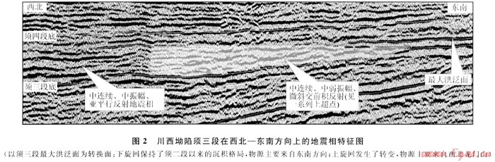 須三段上旋回龍門山成為主物源區(qū),南東 北西向的測線顯示出地層厚度向南東變厚,明顯能看到斜交前積反射特征。地震相由北西向南東可分為中連續(xù)中弱振幅平行反射地震相、弱連續(xù)變振幅低緩丘狀反射地震相和中低連續(xù)變振幅亞平行反射地震相。