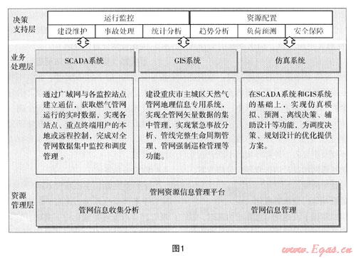 應(yīng)用層——輸配管網(wǎng)數(shù)據(jù)采集與監(jiān)視控制系統(tǒng)(SCADA系統(tǒng))、地理信息系統(tǒng)(GIS系統(tǒng))、仿真系統(tǒng)為一體的管網(wǎng)資源信息管理平臺。