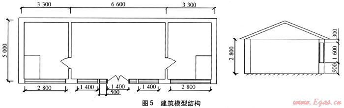 以抽樣調(diào)查得到的典型建筑為模型,確定建筑模型的建筑面積為66m2,坐北朝南,建筑窗墻比為0.52,體形系數(shù)為0.37,建筑模型結(jié)構(gòu)見圖5,圖中數(shù)值單位為mm。圍護結(jié)構(gòu)的傳熱系數(shù)見表1。按上述建筑結(jié)構(gòu)進行耗熱量計算,室內(nèi)供暖設(shè)計溫度按14℃計算,得到單位建筑面積耗熱量為131W/m2,散熱器供暖系統(tǒng)供、回水溫度取80、60℃,地板輻射供暖系統(tǒng)供、回水溫度取55、45℃。